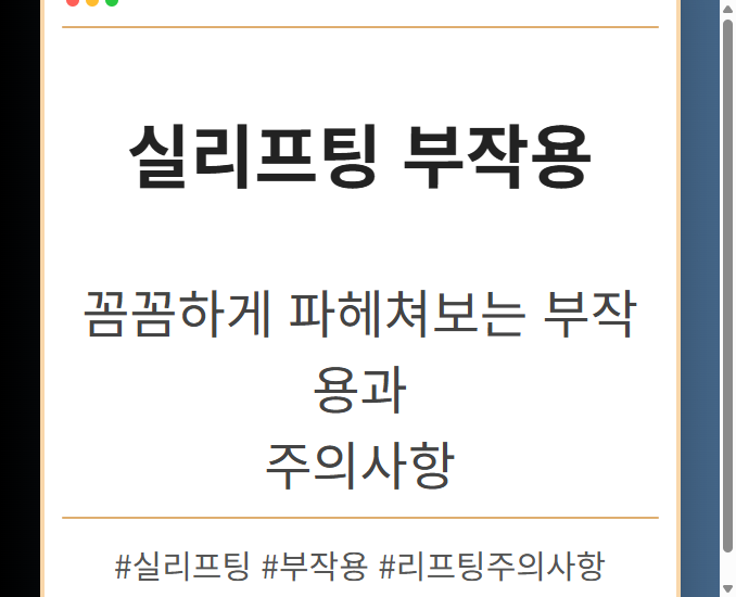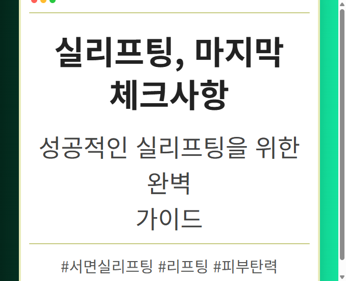 목차 실리프팅, 왜실패하는 걸까요? 시술 전정확한 상담이 필수 나에게 맞는 실선택이 중요 정품/정량사용,기본을 지켜야 실리프팅후,주의사항을 잘 지켜야회복이 빨라요 붓기와멍, 어떻게