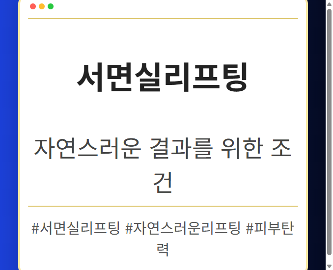 목차 서면 실리프팅, 왜 통증을 걱정할까요? 과거 시술 경험의 영향 주변 사람들의 이야기 인터넷 정보의 홍수 실리프팅 시 통증, 어떻게